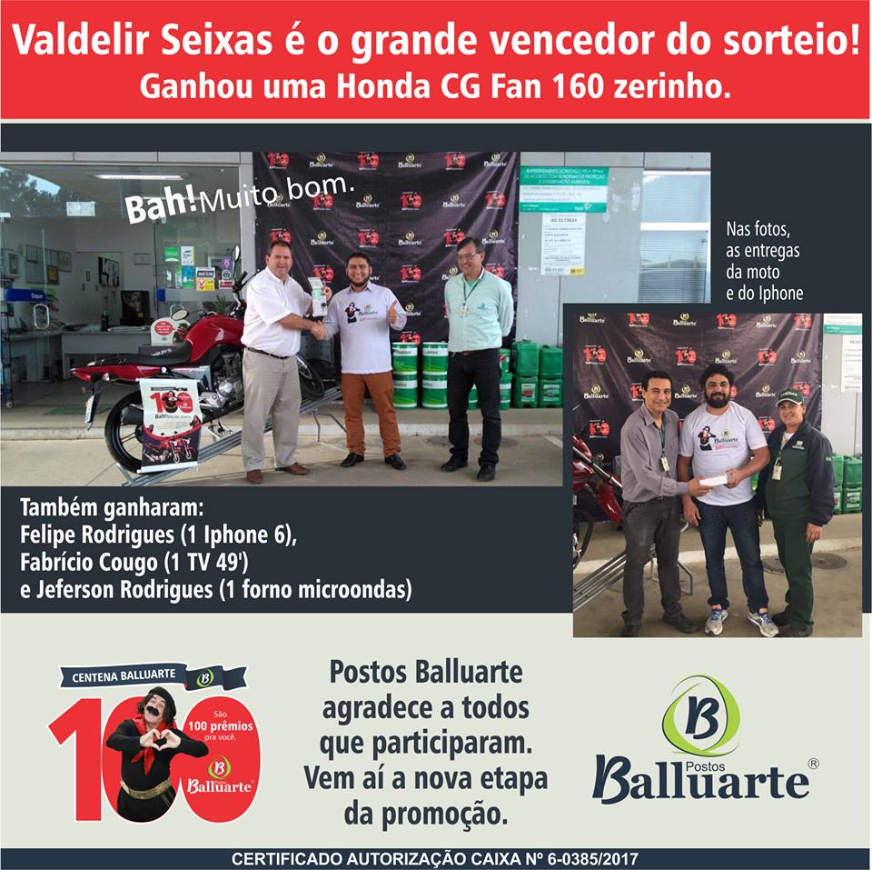 Durante todo o ano de 2017 anunciamos ganhadores da Promoção centena Balluarte, foram mais de 100 Premios sorteados em nossas unidades, incluindo Smartfones, Tablets e duas motos Honda CG Fan 0km, nossa equipe agradece imensamente aos clientes que aderiram a campanha e parabeniza os ganhadores, em breve muito mais prêmios para nossos clientes, Postos Balluarte, Bahhh Muito bom!!!!